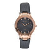 The stylish Leijona Utö watch has a 33 mm wide rose gold-colored steel case and a grey satin strap. The gray dial has rose gold-colored indexes and hands. The watch is splash-proof with a water resistance rating of 50 meters.