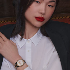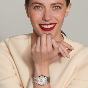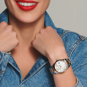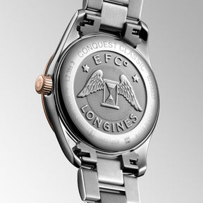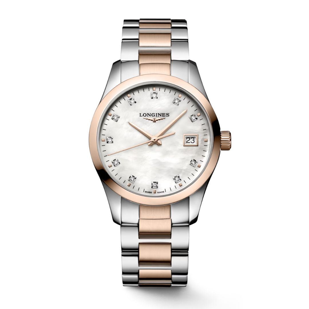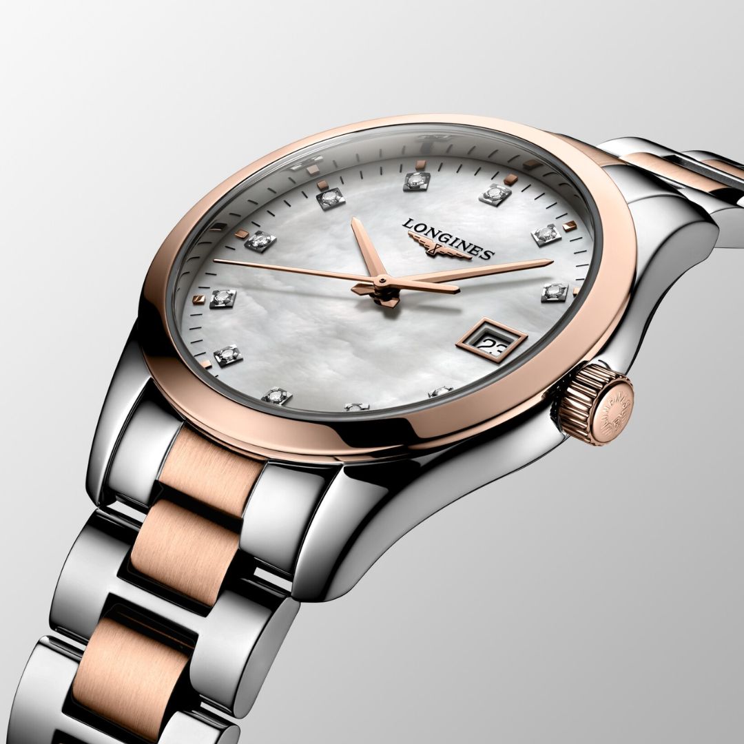 The Longines Conquest watch combines the elegance of 1954 with sophisticated modern features. This Conquest watch features a combination of steel grey and rose gold. The watch has a 34 mm steel case and a rose gold PVD-coated bezel. The steel bracelet is three-row and two-tone, with the middle row being rose gold PVD-coated. The watch has a mother-of-pearl dial with 11 diamond indexes and rose gold hands. The watch is powered by a quartz movement and is splash-proof with a water resistance rating of 50 metres. The dial is protected by scratch-resistant sapphire crystal. The watch has a date window at three o'clock.