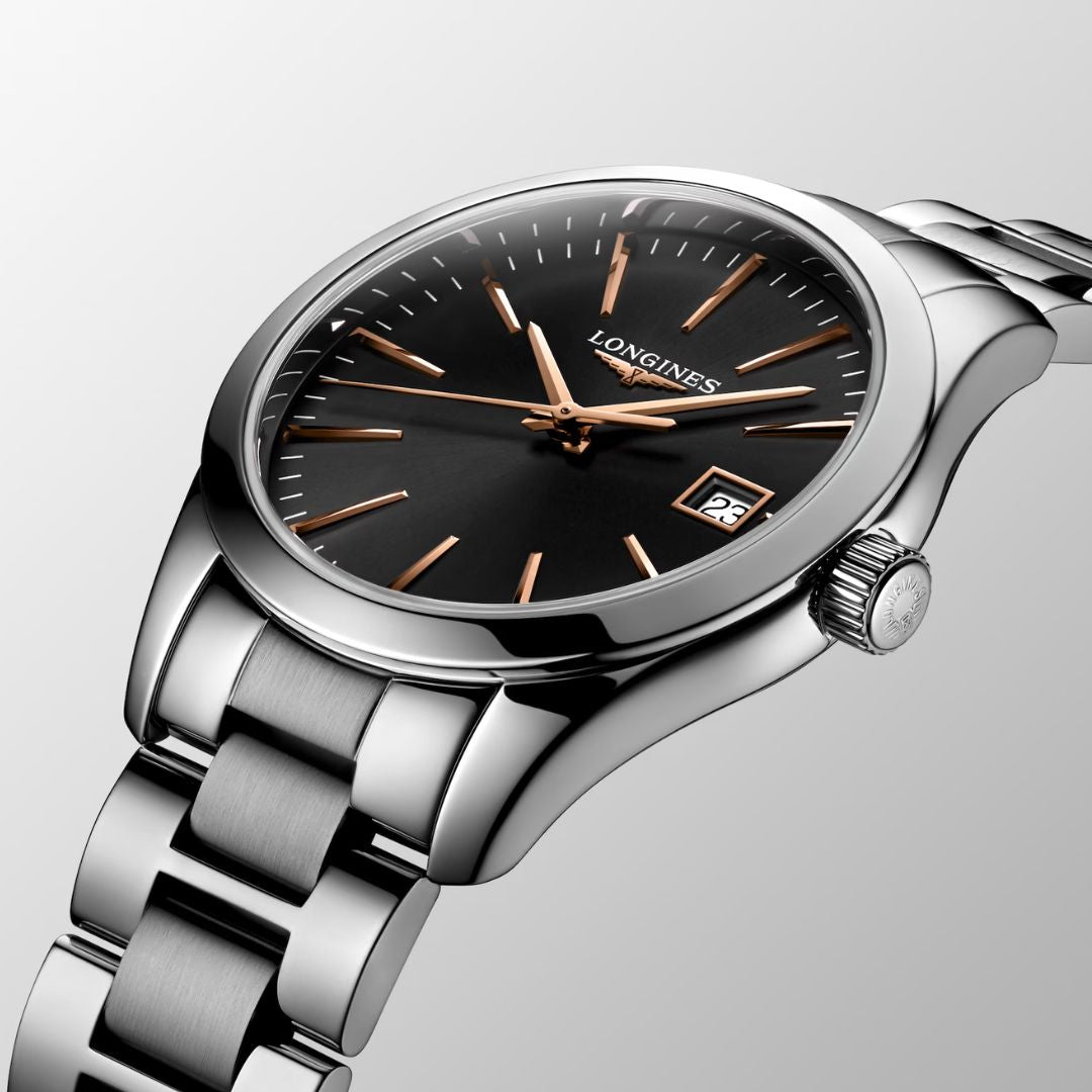 Steel Grey Longines Conquest L23864526 Watch with Black Dial and Rose Gold Indexes and Hands
