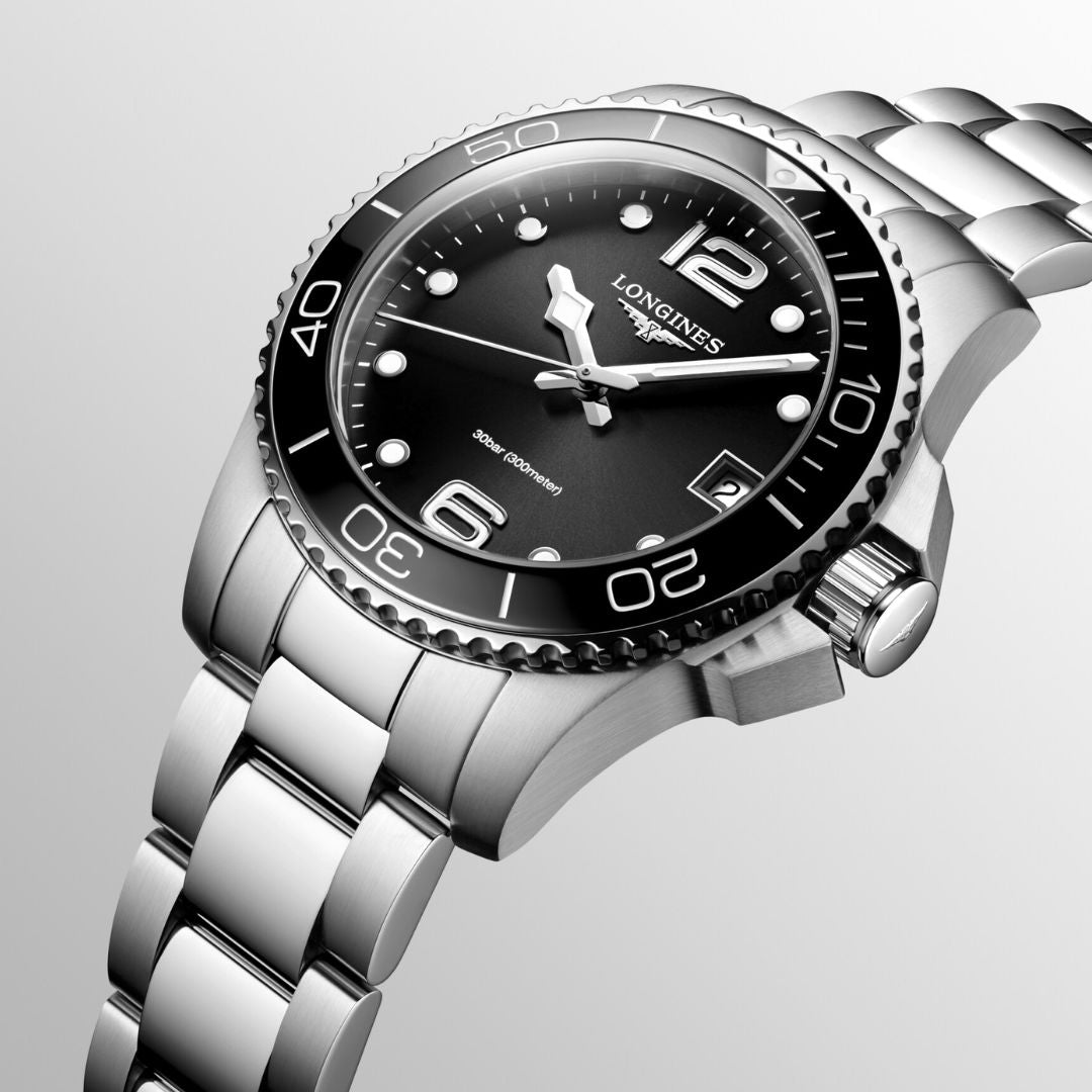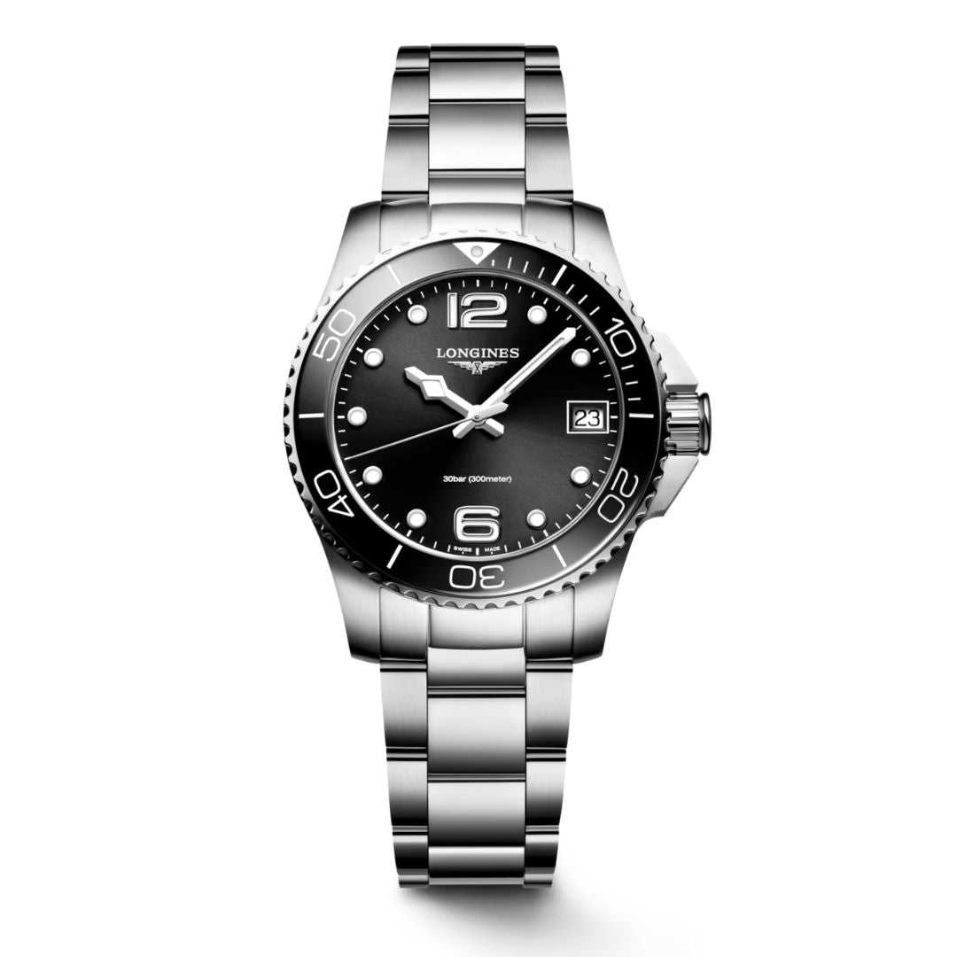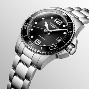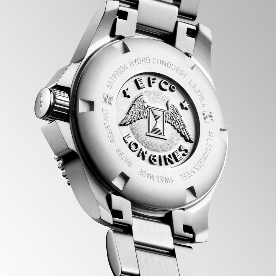 The HydroConquest sports watch is water resistant to 300 meters, has a screw-lock crown, a unidirectional solid bezel, and strong luminosity on the hands, indexes, and bezel. The dial is protected by scratch-resistant sapphire crystal with an anti-reflective coating. The watch has a precise quartz movement.