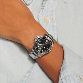 This Longines HydroConquest watch is a stylish combination of steel grey and black. The sun-brushed, black dial features silver-tone hands and silver-edged indexes. The 32 mm wide case is surrounded by a black ceramic bezel that rotates in one direction. The bezel is decorated with a gear-shaped, steel grey part.