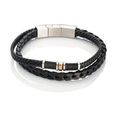 The Stelle leather bracelet is a stylish accessory for men. The two-piece bracelet features braided leather, steel pieces and a PVD rose gold-plated steel piece with a stone. The bracelet clasp is stainless steel. The bracelet is 21 cm long and 22 cm with the adjustment piece.