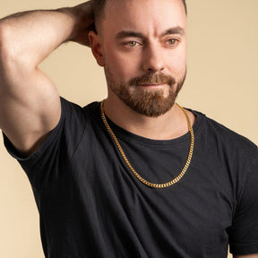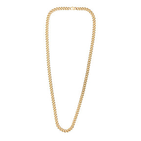 The Stelle curb chain is a stylish accessory on its own or combined with a pendant. The armor chain is made of PVD Gold-Plated stainless steel. It is 6 mm wide and 60 cm long. The armor chain consists of round and flat links that flow beautifully and form a durable chain.