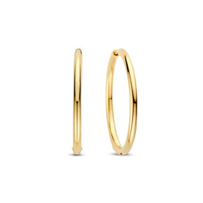 The classic TI SENTO hoop earrings are easy to combine with various outfits and jewelry sets thanks to their simple appearance. The earrings are made of yellow gold-plated silver and have a beautiful shiny surface. The diameter of the earring is 35 mm. The earrings have a hinged closure.