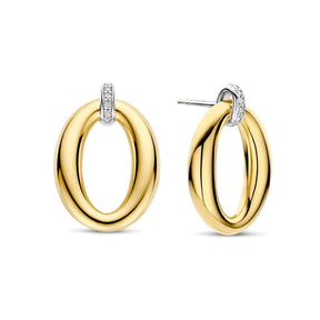 The classic TI SENTO earrings are easy to combine with various outfits and jewelry sets thanks to their simple appearance. The earrings are made of yellow gold-plated silver and have a beautiful shiny surface. The earring has an oval shape and a silver part that attaches to the ear, which is decorated with sparkling zircons. The size of the earring is 24x17 mm and has a pin fastening.