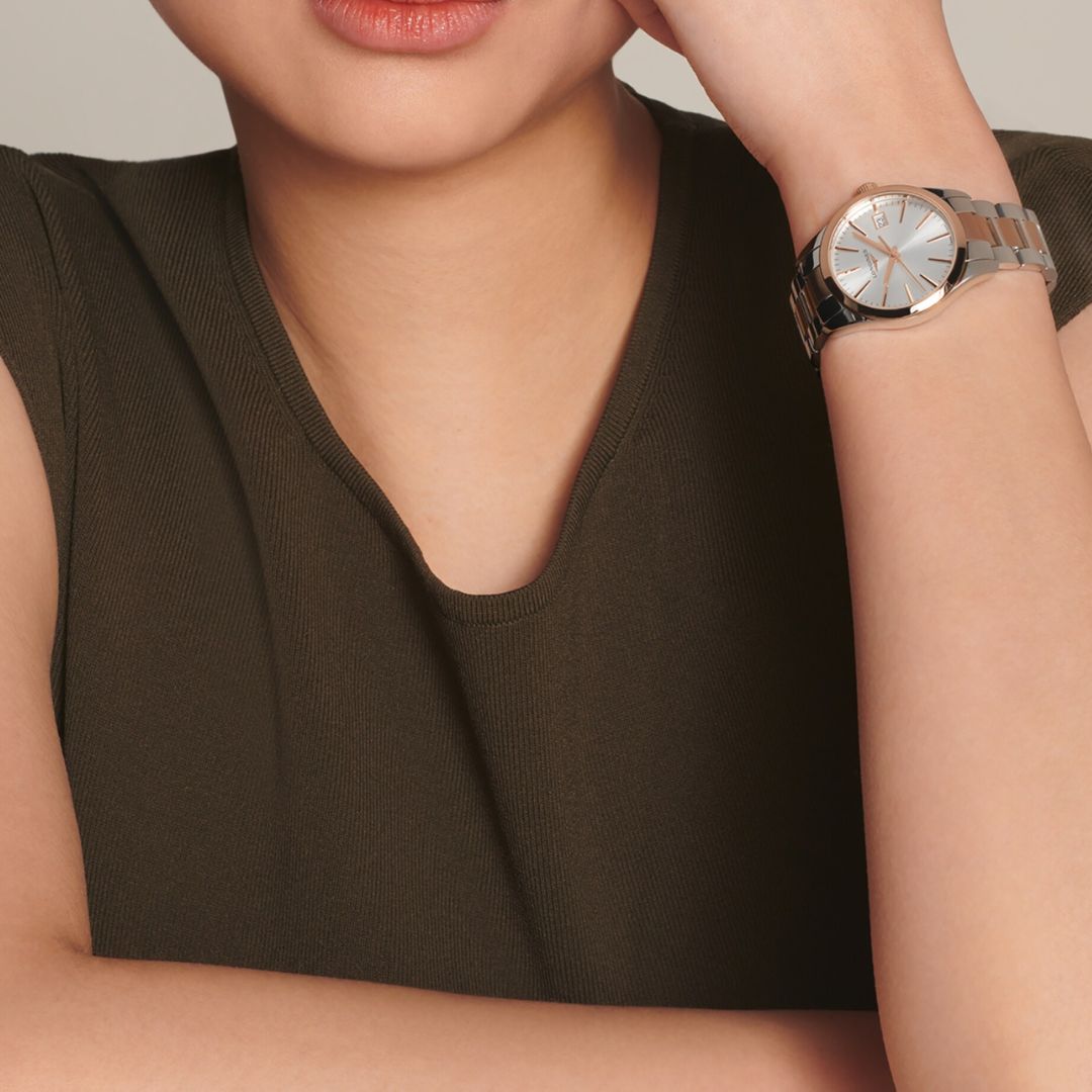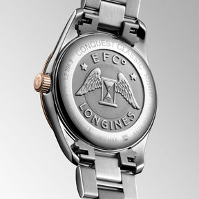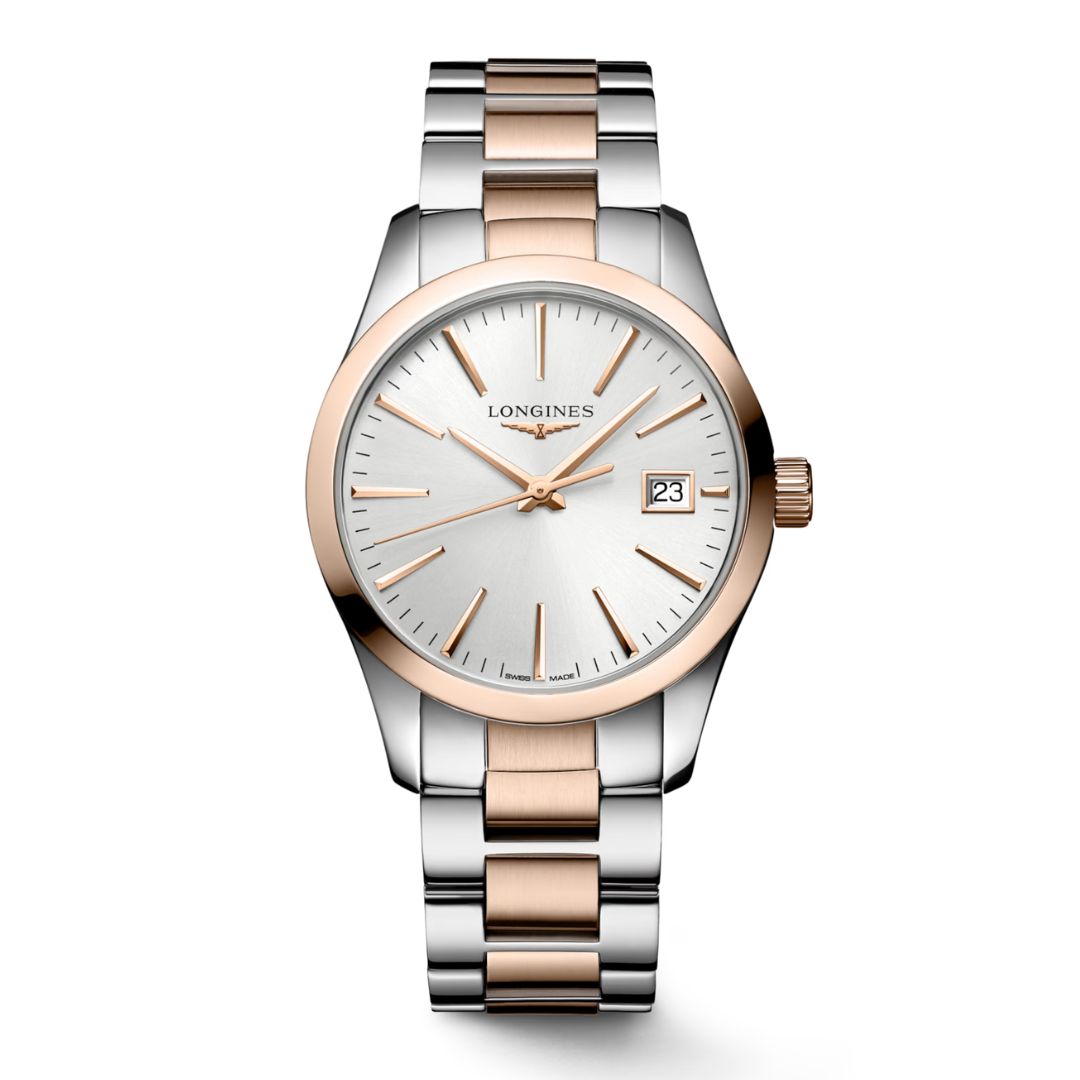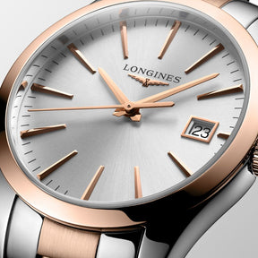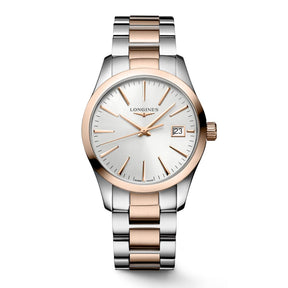 The Longines Conquest watch combines the elegance of 1954 with sophisticated modern features. This Conquest watch features a combination of steel grey and rose gold. The watch has a 34 mm steel case and a rose gold PVD-coated bezel. The steel bracelet is three-row and two-tone, with the middle row being rose gold PVD-coated. The watch has a silver-colored dial and rose gold-colored indexes and hands. The watch is powered by a quartz movement and is splash-proof with a water resistance rating of 50 meters. The dial is protected by scratch-resistant sapphire crystal. The watch has a date window at three o'clock.