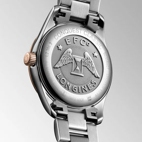 The Longines Conquest watch combines the elegance of 1954 with sophisticated modern features. This Conquest watch features a combination of steel grey and rose gold. The watch has a 34 mm steel case and a rose gold PVD-coated bezel. The steel bracelet is three-row and two-tone, with the middle row being rose gold PVD-coated. The watch has a classic blue dial and rose gold indexes and hands. The watch is powered by a quartz movement and is splash-proof with a water resistance rating of 50 meters. The dial is protected by scratch-resistant sapphire crystal. The watch has a date window at three o'clock.