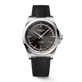 Steel Grey Longines Conquest L38304529 Watch with Black Dial and Rubber Strap, 41 mm