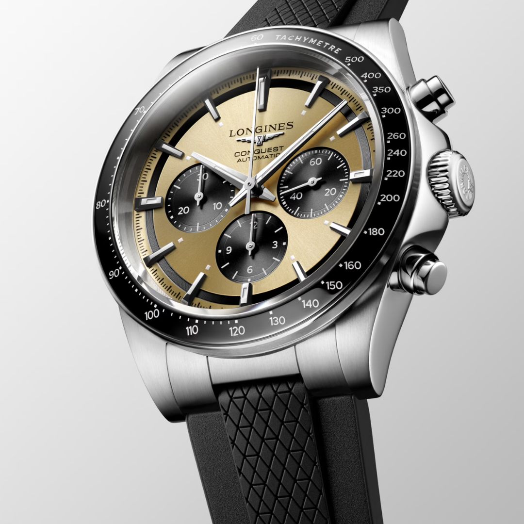This stylish Longines Conquest Chronograph watch combines steel grey with a golden brown dial and a black ceramic bezel, as well as a stylishly textured black rubber strap. The bezel features a tachymeter scale and the brown dial features black chronograph displays. The steel grey hands and indices are luminescent, making the watch easy to read in the dark.
