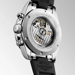 The Longines Conquest watch has an automatic movement with a 59-hour power reserve. The watch is water-resistant to 100 meters, meaning it can withstand swimming and snorkeling, as well as moderate shocks underwater. The watch has a screw-locking crown and a steel bracelet with a tri-fold clasp with push buttons. The dial is protected by scratch-resistant sapphire crystal with anti-reflective treatment.