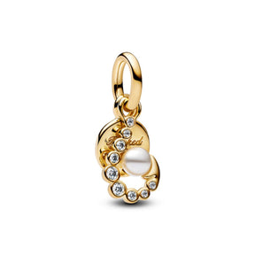 The Pandora Hook Double dangle charm features a hook decorated with zircons and a faux pearl, and a plaque with the text: "Hooked on You". The charm is made of 14 karat yellow gold-plated jewelry metal. The charm is suitable for combining with bracelets and necklaces from the Moments series. Give it as a gift to an important relative or combine it with other Pandora charms to create your own personal ensemble.