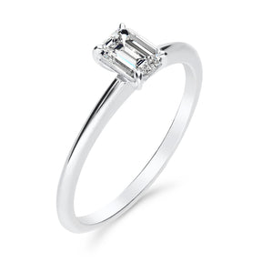 In the stunning Silván diamond ring features a striking emerald-cut diamond and a delicate band. The diamond weighs 0,50 carats (GIA). The body of the ring is made entirely of 14 carat recycled gold. The Emerald diamond ring is a sophisticated and trendy choice for today's bride.