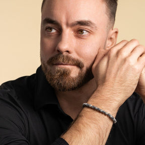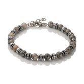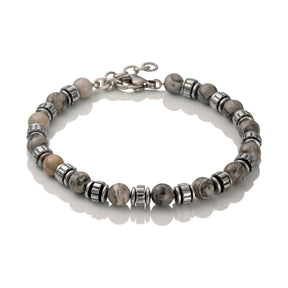The Stelle bracelet is a stylish accessory for men. The bracelet chain has grey stone beads and stylishly shaped steel pieces in between. The width of the chain is 6 mm and the length is adjustable between 19-22.5 cm.