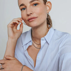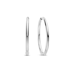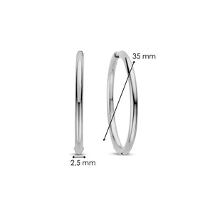 The classic TI SENTO hoop earrings are easy to combine with various outfits and jewelry sets thanks to their simple appearance. The earrings are made of silver and have a beautiful shiny surface. The diameter of the earring is 35 mm. The earrings have a hinged closure.