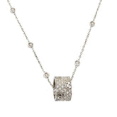 Valkokultaisessa Gucci-kaulakorussa on sormuksen muotoinen riipus GG-koristeilla ja timanteilla.