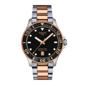 Kaksivärinen Tissot Seastar 1000 Quartz T1204102205101 rannekello mustalla kellotaululla ja ruusukullanvärisillä yksityiskohdilla