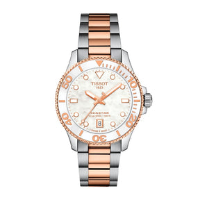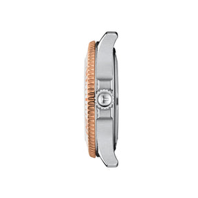 Kaksivärinen Tissot Seastar 1000 Quartz T1202102211100 rannekello helmiäiskellotaululla ja ruusukullanvärisellä kellonkehällä
